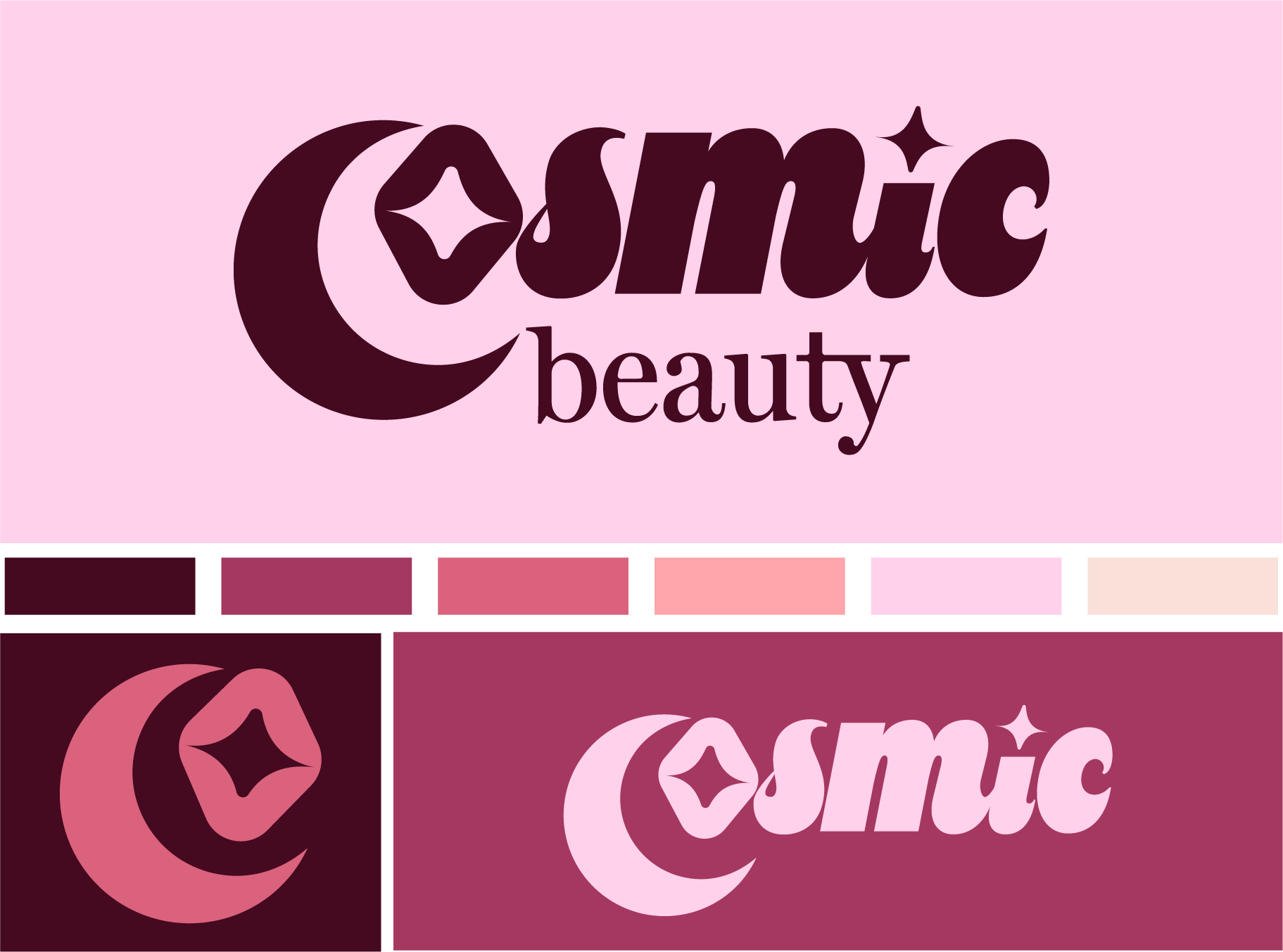 My idea for the logo started as wanting to incorporate an astral connection into the branding, as it is an important aspect of the identity. I created a vector of a retro star, and overlaid it on top of a diamond star shape, experimenting with potential pattern ideas. When doing this, I noticed it resembled the shape and look of puckered lips/a kiss mark (perfect for Cosmic Beauty!).